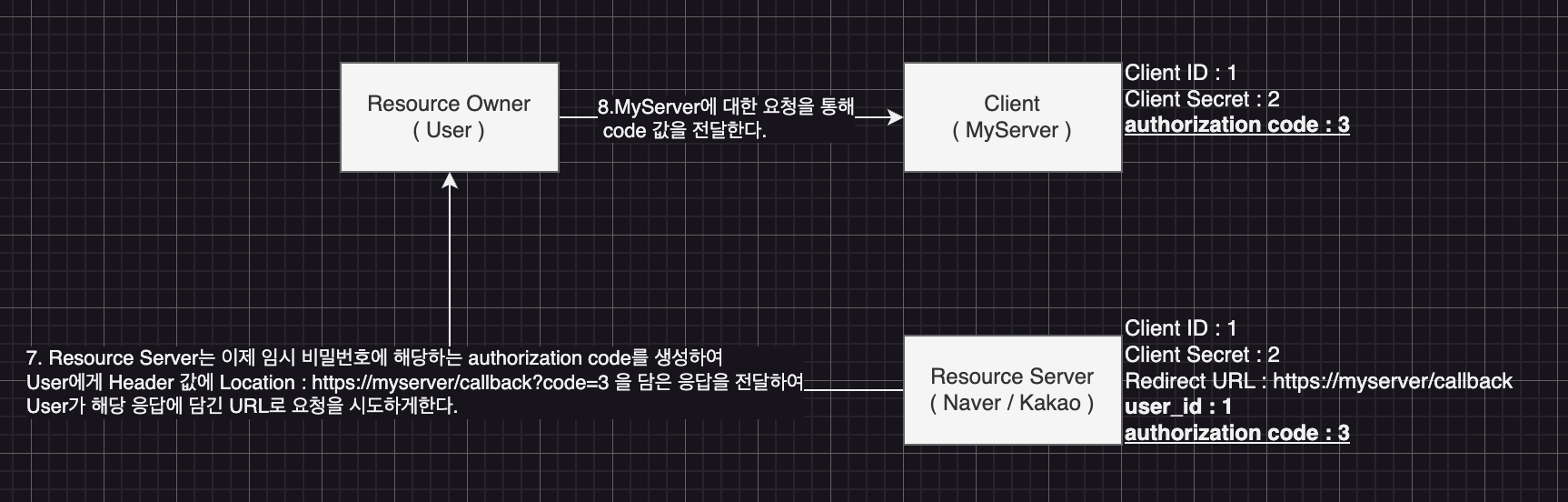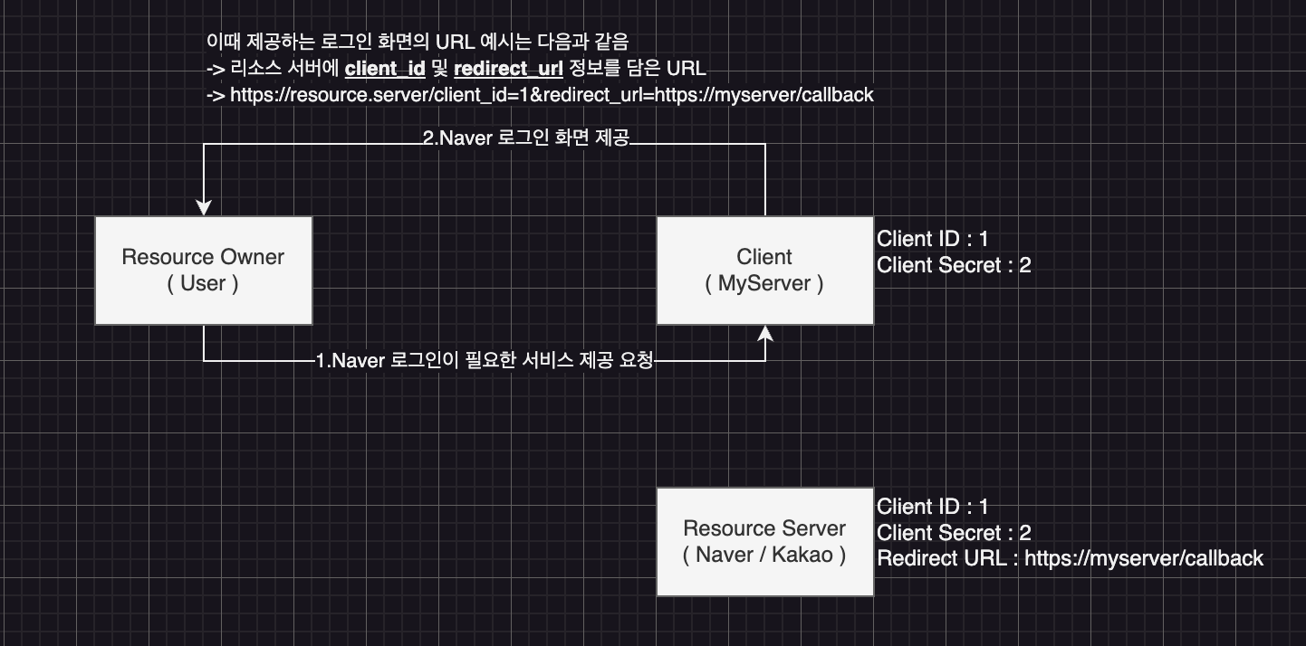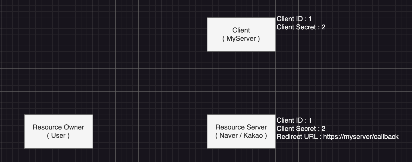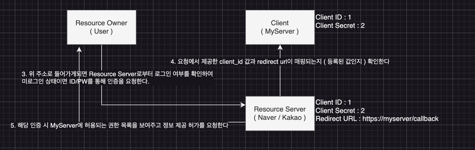여기서 Resource Owner는 MyServer (내가 구축한 서비스를 제공하는 서버)에서 네이버/카카오 로그인 등을 이용하려고하는 사용자를 의미하며, Resource Server는 네이버/카카오 로그인에 대한 인증을 제공하는 서버를 의미한다.