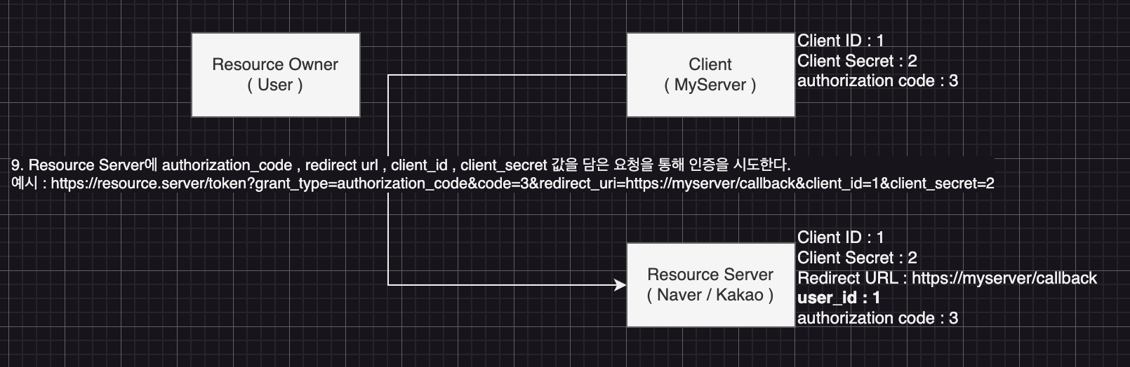 이제 MyServer는 User로부터 전달받은 code값을 포함하여 Resource Server로 redirect_url, client_id, client_secret 를 사용하여 Resource Server로 인증을 시도한다.