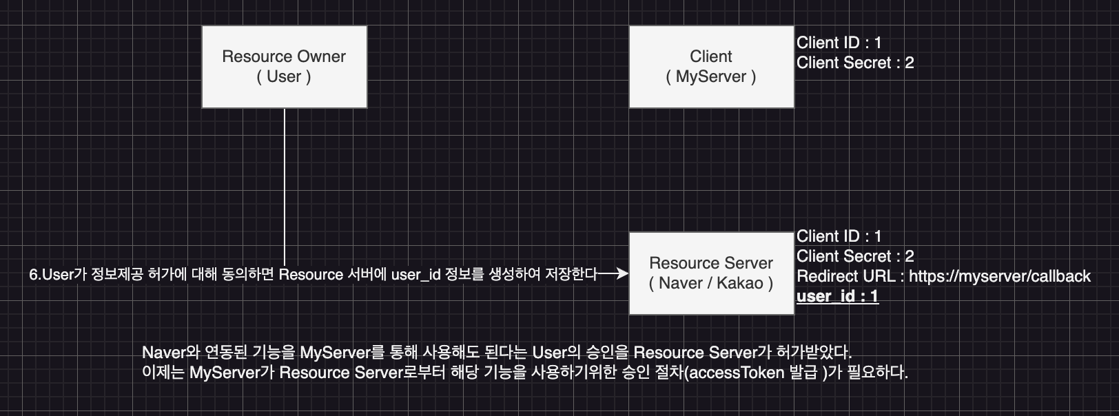 User가 제공할 권한에 대해 동의하면 Resource Server에 해당 client_id에 대한 user_id를 새롭게 생성하여 저장한다.