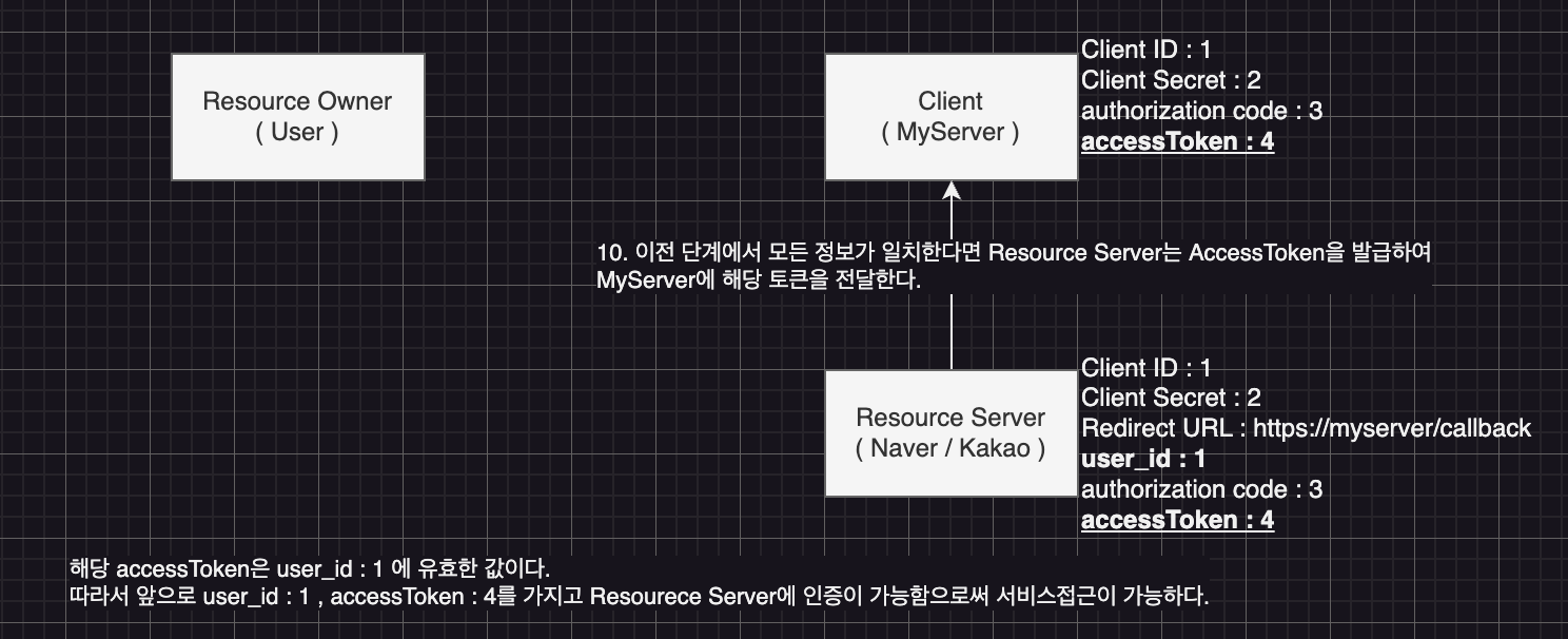 마지막으로 이전 단계에서 모든 정보가 일치한다면 Resource Server는 AccessToken을 발급하여 MyServer에 전달함으로써 OAuth 인증에 필요한 AccessToken 발급이 완료된다.