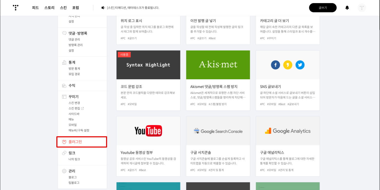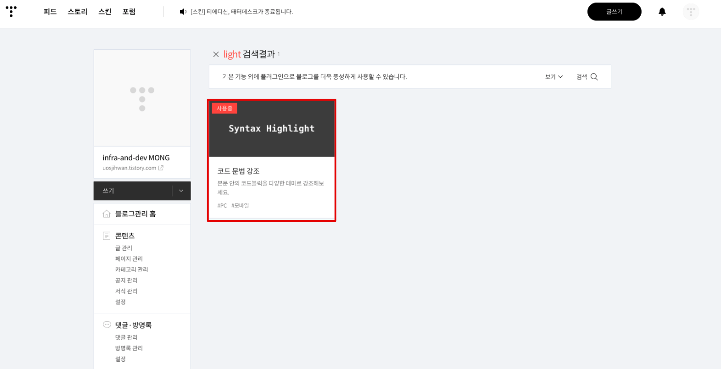 Tistory 자체에서 제공하는 플러그인을 통해 하이라이트를 적용할 수 있다.