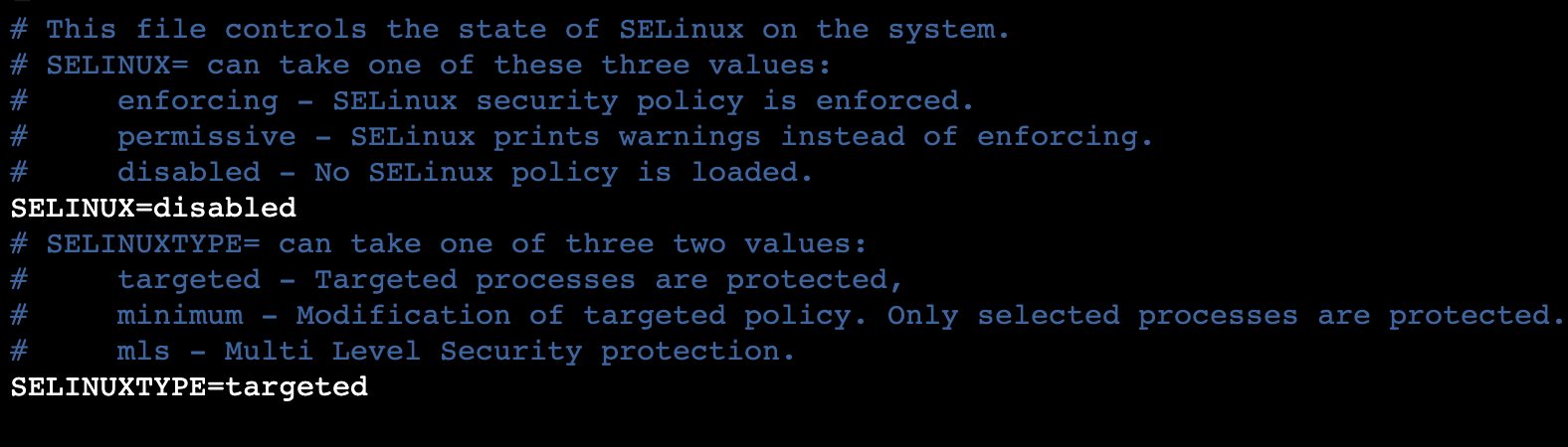 SELINUX=disabled 설정 후 reboot하여 값을 영구적으로 변경하자. ( 영구 변경 )