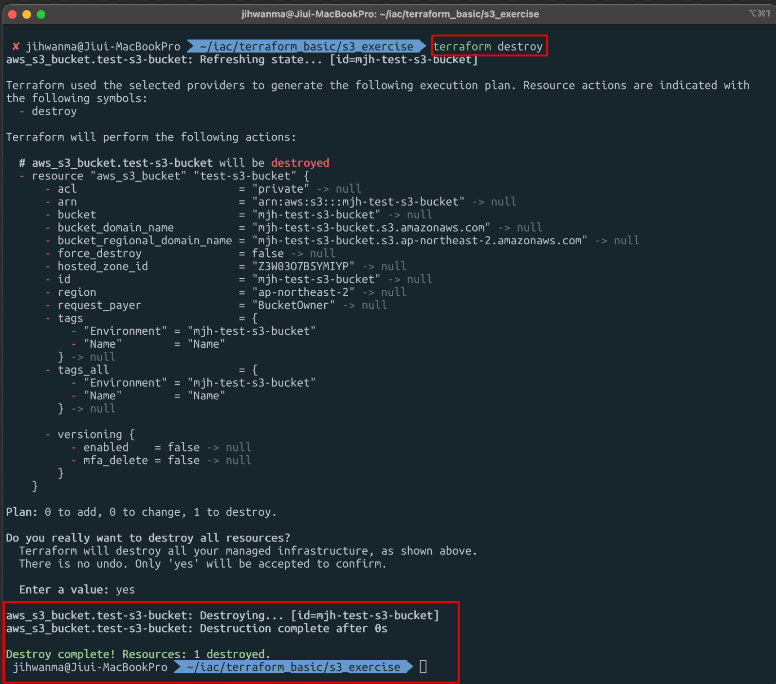실습에서 생성한 자원을 모두 삭제하자. `terraform destroy` 명령어를 통해 삭제가 가능하다.