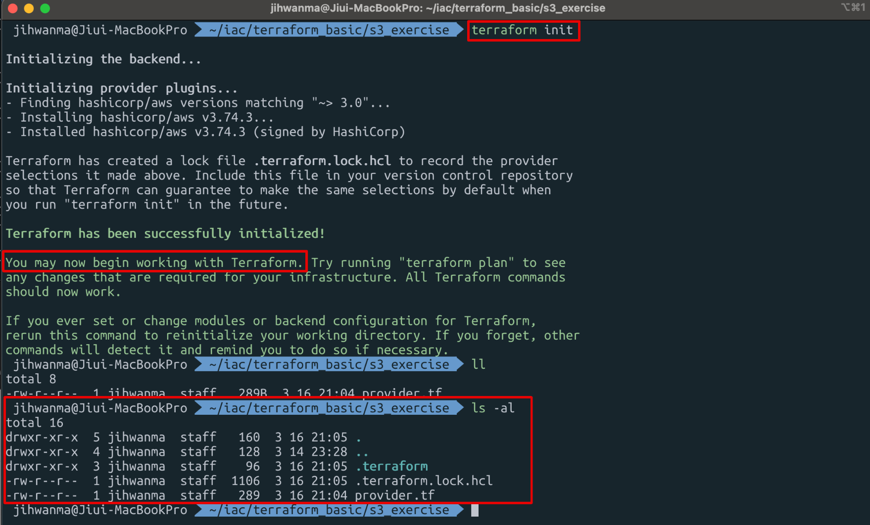 - 예를들어 provider.tf 파일에 프로바이더 정보를 기입한 뒤에 init 명령어를 사용하여 워킹 디렉토리를 세팅할 수 있다.