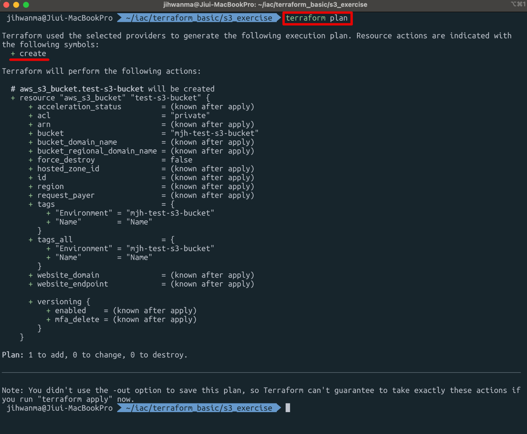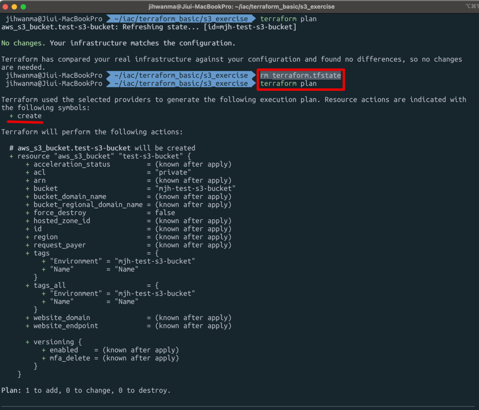 .tfstate를 삭제하면 기존에 이미 생성한 s3 자원임에도 불구하고 `terraform plan` 명령어 시 새로 생성해야하는 자원으로 인식한다.