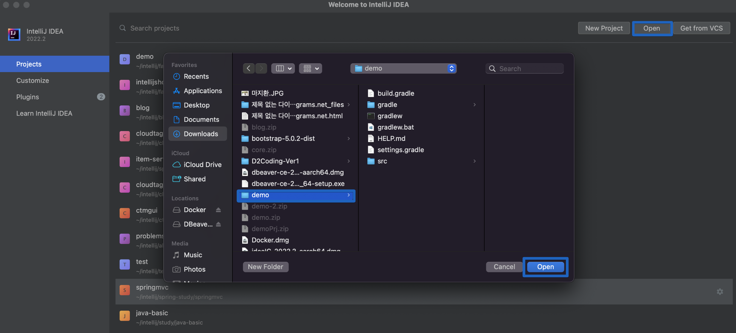 최종적으로 GENERATE 선택으로인해 다운로드된 디렉토리를 IntelliJ 의 Open Project를 통해 열면 세팅이 완료된다.
