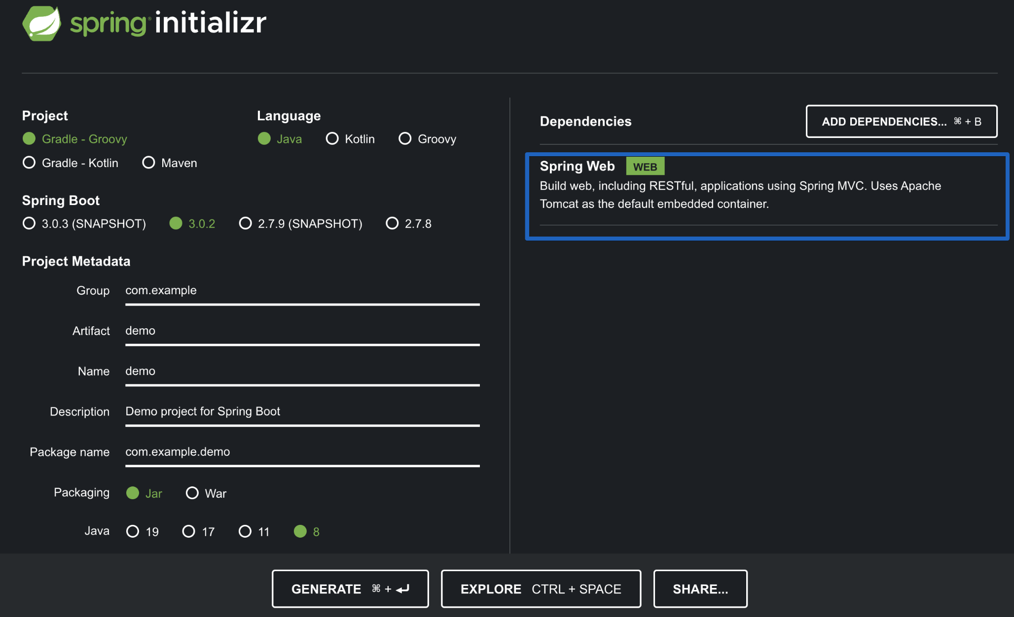 Dependencies 의 ADD DEPENDENCIES... 를 선택하여 위 화면과 같이 Spring WEB을 선택한 뒤에 GENERATE를 선택하자.